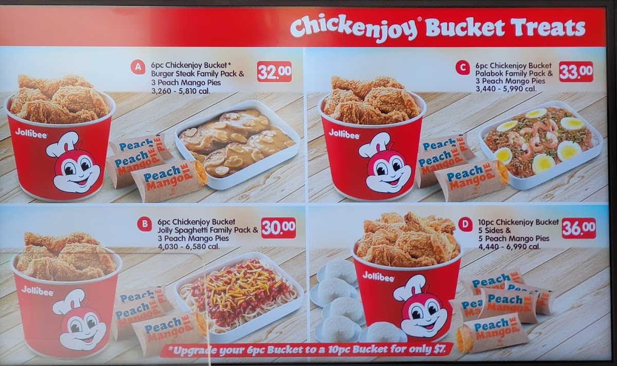 6pc of our next-level crispy, next-level juicy Chickenjoy fried chicken (3 legs, 3 thighs, Choose between Original or Spicy) served with a Palabok Fiesta Family Pack and 3 pies. Note: Palabok sauce contains pork that cannot be removed.